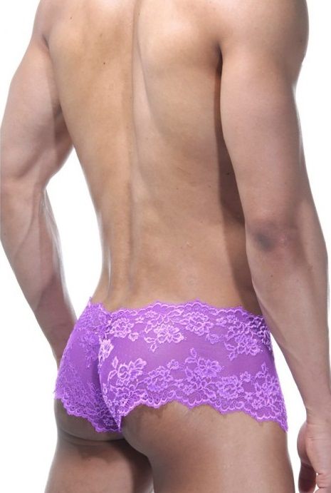 Кружевные трусы-хипсы для мужчин, фиолетового цвета. Спереди вставка из белой, полупрозрачной очень мелкой сетчатой ткани.