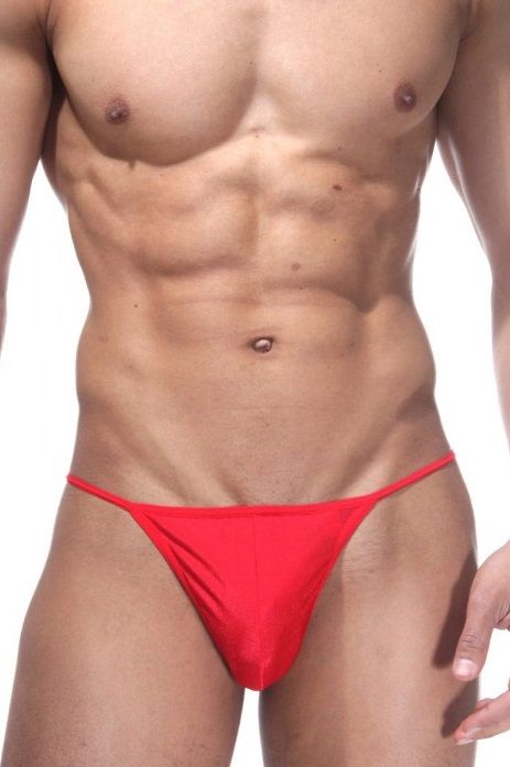 Трусы-стринги для мужчин, из гладкой блестящей тянущейся ткани. Сзади Т-образный узор-цепочка из металлических декоративных колец.