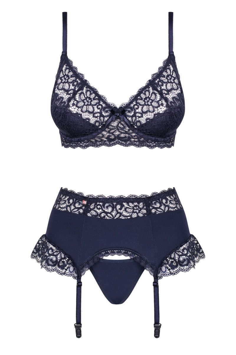 Стильный комплект женского белья. Бюстгальтер на косточках и поролоне с подкладкой прекрасно подходит для пышной груди. Спереди бра украшен атласным бантиком. Сзади застежка на три ряда крючков для наилучшего прилегания. Бретели регулируются по длине. Широкий пояс с высокой посадкой также расшит кружевом и оборками. Сзади застежка на крючки. Пажи регулируются по длине. В комплекте: бюстгальтер, трусики-стринги, пояс для чулок.