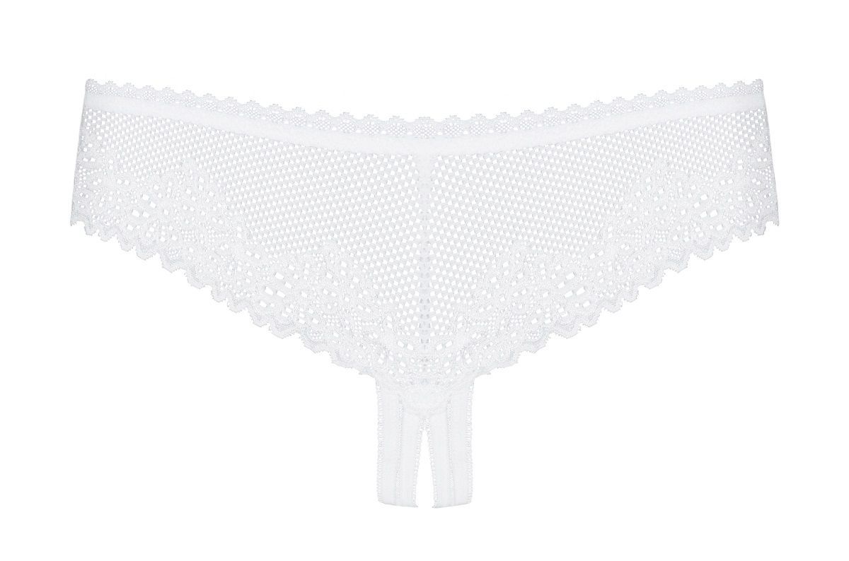 Пикантные трусики-стринги с разрезом на ластовице выполнены из мягкой эластичной ткани. Кружево спереди и сзади в сочетании с легкой сеточкой подчеркивает бедра и ягодицы. Разрез в зоне бикини украшен бантиками.