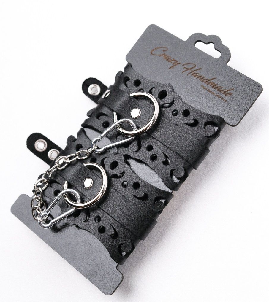 Наручники из кожи с узорами. Наручники имеют кольца для крепления и металлическую сцепку.